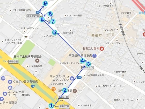 千葉県道57号千葉鎌ヶ谷松戸線は、千葉市美浜区幕張西二丁目の国道14号(千葉街道)との交点から松戸市の国道6号との交点である根木内交差点までを結ぶ主要地方道である。この中でも幕張4丁目交差点~実籾駅前~習志野台団地入口交差点(国道296号線)の区間を「実籾街道」と呼ぶことも。そんな「実籾街道」の起点である幕張4丁目交差点の周辺に不思議な場所を発見した…というのが今回の記事です。以下の写真の位置とルートを貼っておきます。